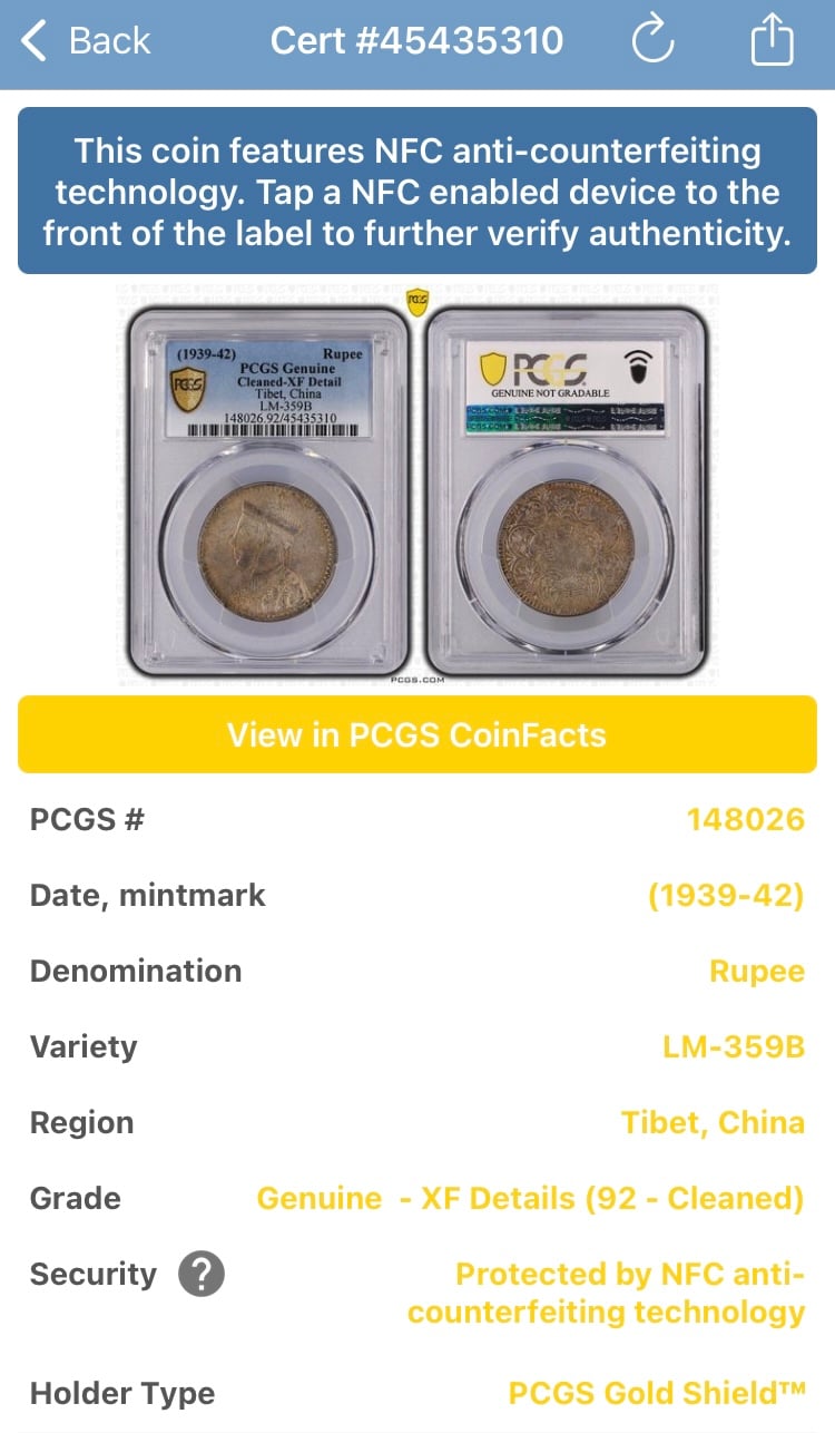 チベット 1939-42年 ルピー 銀貨 PCGS認証 チベット 1939-42年 ルピー 銀貨 PCGS認証 チベット 1939-42年 ルピー